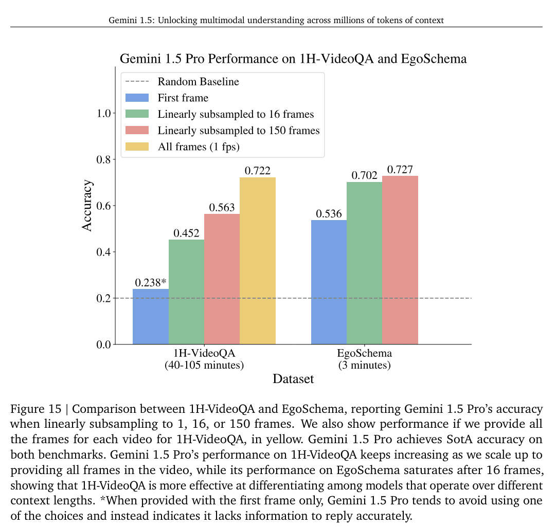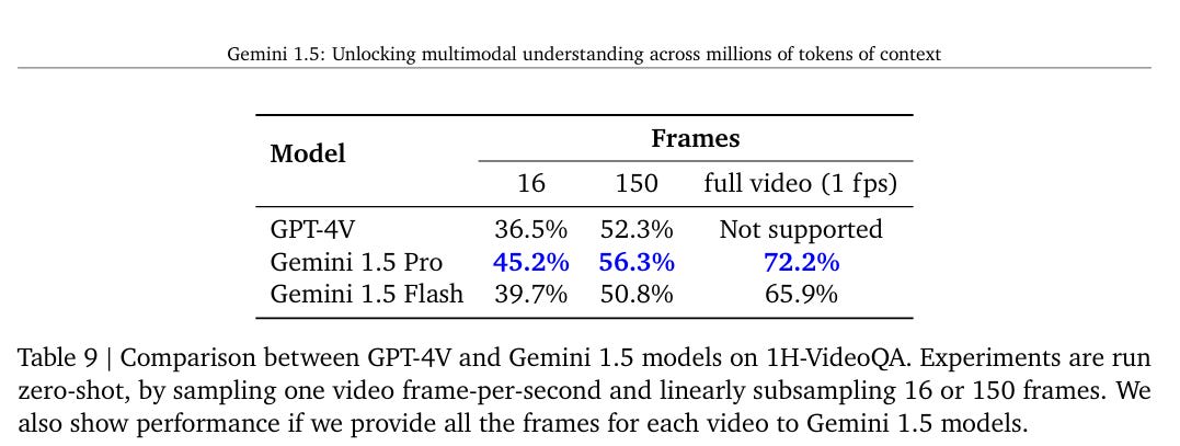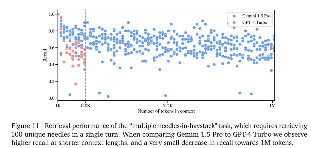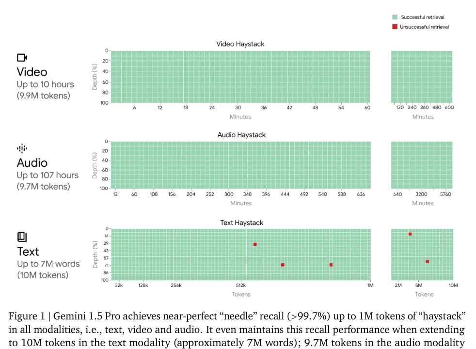 In 5.2.1.2 and 5.2.1.3 they do text and video haystack tests, which go very well for all models tested, with Gemini 1.5 Pro extending its range beyond where rivals run out of context window space. In the video test the needle is text on the screen for one frame.