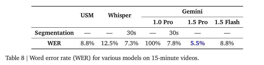 In 5.2.1.4 they do an audio test, with the keyword being spoken. Even up to 107 hours of footage Gemini Pro gets it right every time and Flash scored 98.7%, versus 94.5% for whisper plus GPT-4 up to 11 hours. This was before GPT-4o.