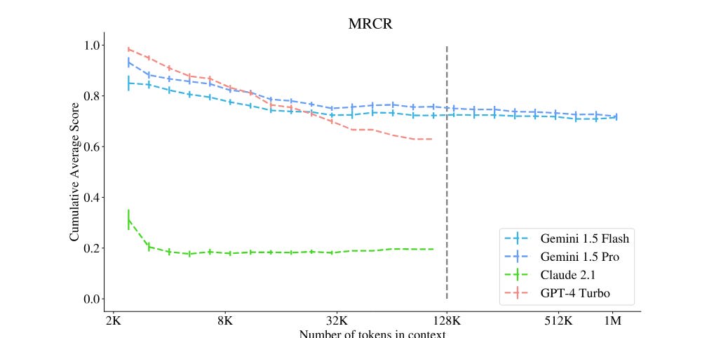Then they try adding other complexities, via a test called MRCR, where the model has to do things like retrieve the first instance of something.