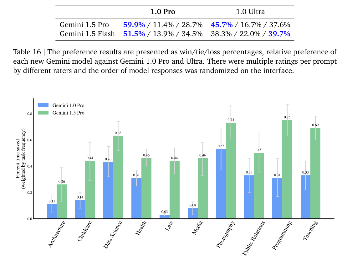 Finally we have the awkwardly titles ‘hard, externally proposed real-world GenAI use cases,’ which is a great thing to test. Humans graded the results in the first section (in win/loss/tie mode) and in the second we measure time saved completing tasks, alas we only see 1.0 Pro vs. 1.5 Pro when we know 1.0 Pro was not so good, but also the time saved estimates are in percentages, so they are a pretty big deal if real. This says 75% time saved programming, 69% (nice!) time saved teaching, 63% for data science, and a lot of time saved by everyone.