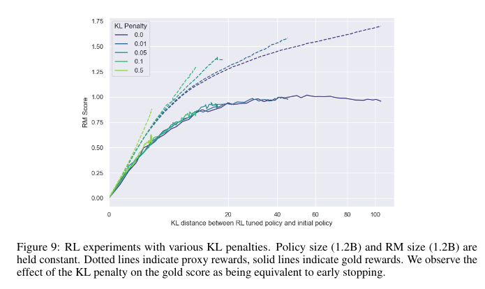 In figure 9 of the paper (copied below), it looks like, from the perspective of the proxy RM, training with KL-regularization does not have the same effect as early stopping. This is pretty shocking to me: looking at only the gold RM lines of figure 9, you’d be tempted to guess that RL with KL penalty learns approximately the same policies as RL with early stopping; but in fact, these different training processes result in learning different policies which the gold RM happens to be indifferent between! Do you have any thoughts about what’s going on here? (I’ll note this seems to suggest that the RL with KL penalty ⇔ early stopping comparison should break down in the limit of proxy RM size and data, since if the proxy RM is very large and trained on a lot of data, then it should be a close approximation to the gold RM, in which case better KL-efficiency for the proxy RM should imply the same for the gold RM. But of course assuming that the proxy RM is much smaller than the gold RM is a more appropriate assumption in practice.)