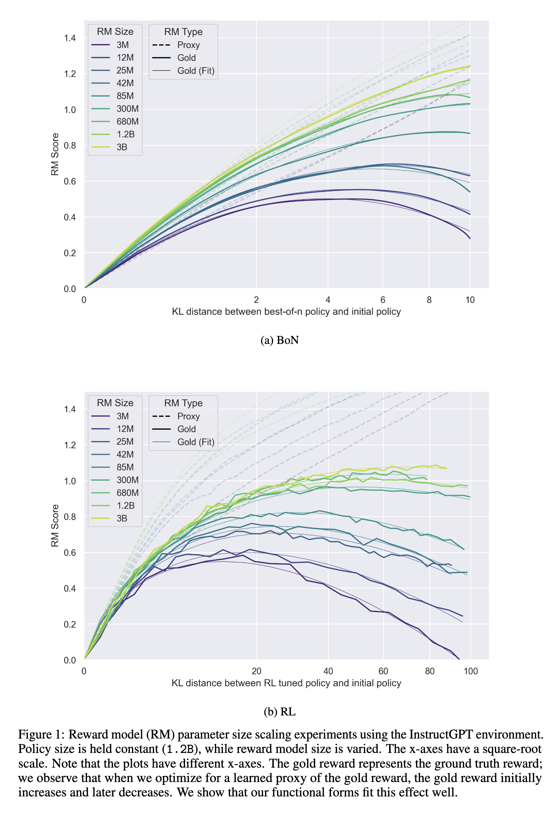I don’t really have a great answer to this. My guess is that it’s related to the fact that the higher penalty runs do a bunch more steps to get to the same KL, and those extra steps do something weird. Also, it’s possible that rather than the gold RM scores becoming more like the proxy RMs with more params/data; perhaps the changed frontier is solely due to some kind of additional exploitation in those extra steps, and evaporates when the RMs become sufficiently good.
