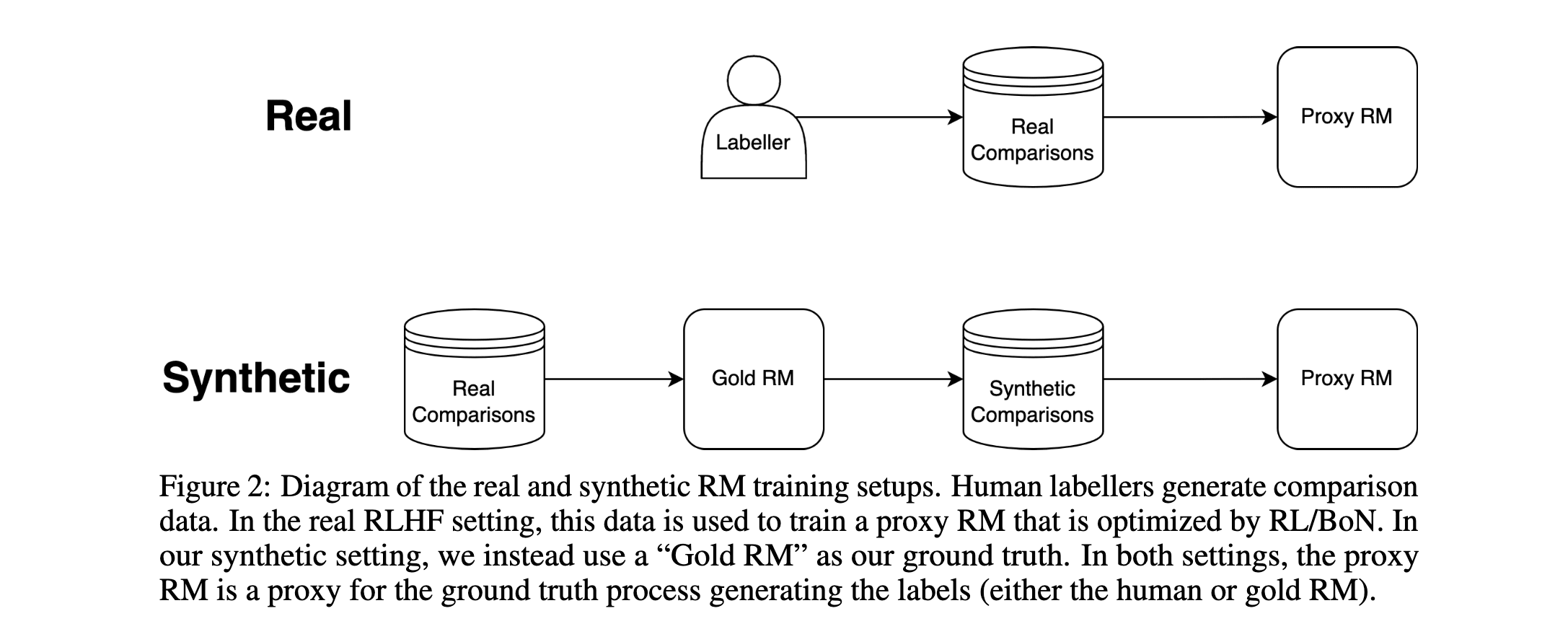 This setup only captures the effect of overoptimizing a learned RM relative to using the ground truth directly. In particular, this setup does not directly capture any mismatch between the ground truth labels and the human intent, which plausibly contains a majority of the difficulty of outer alignment