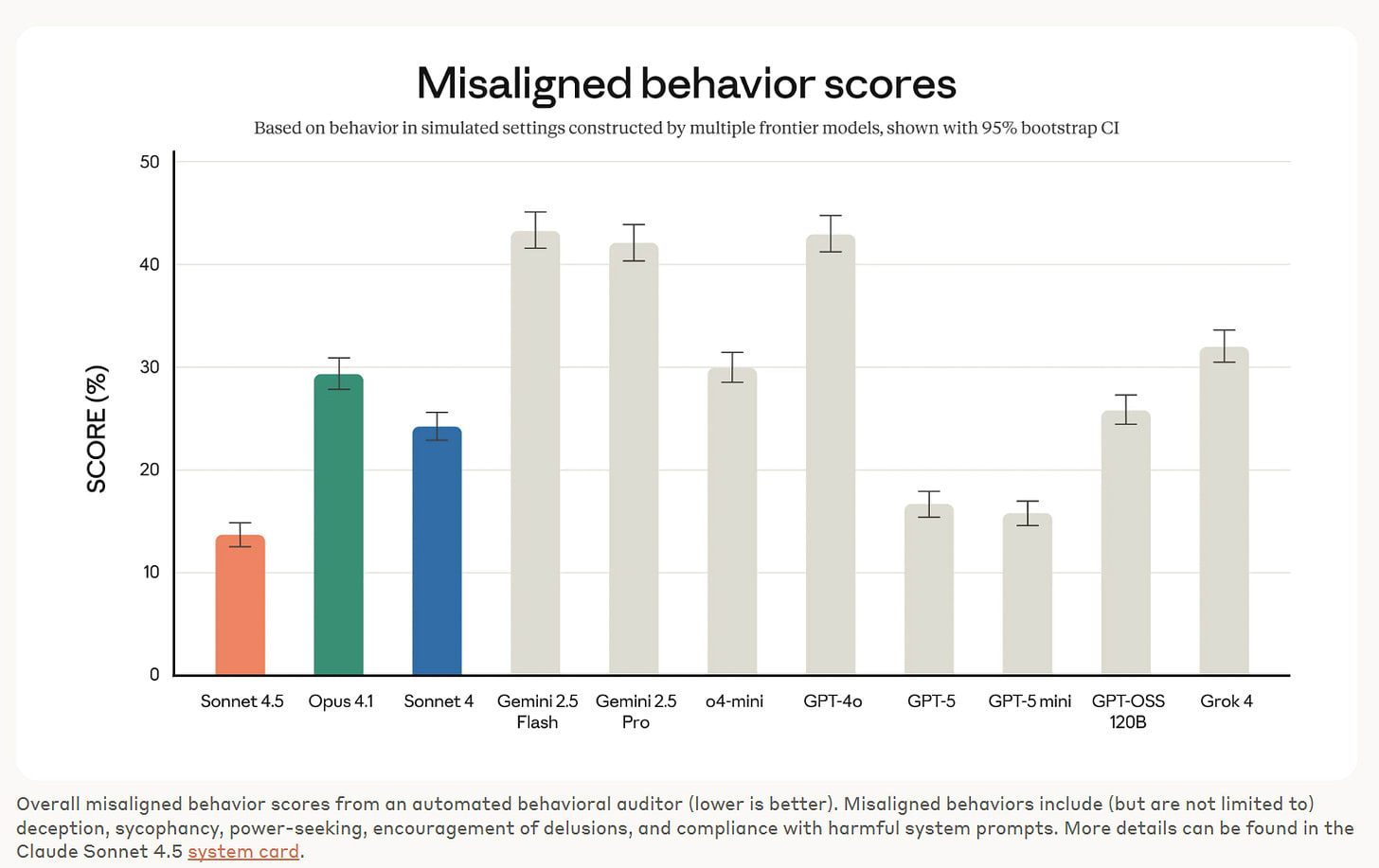 As discussed yesterday, Anthropic has kind of declared an Alignment benchmark, a combination of a lot of different internal tests. By that metric Sonnet 4.5 is the most aligned model from the big three labs, with GPT-5 and GPT-5-Mini also doing well, whereas Gemini and GPT-4o do very poorly and Opus 4.1 and Sonnet 4 are middling.