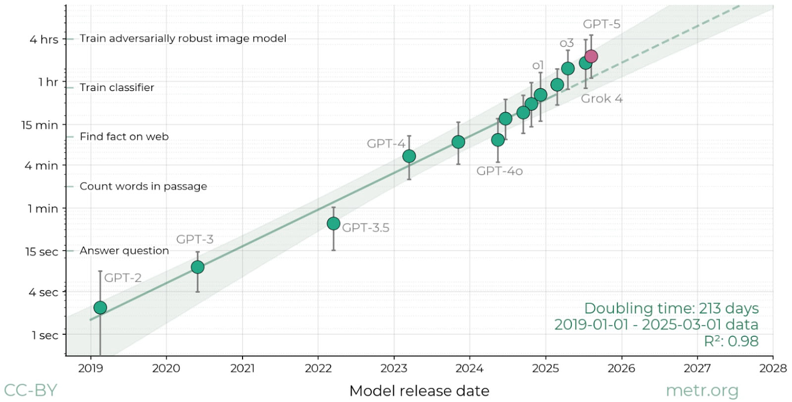 The article’s bottom line is that AI’s task horizon has doubled every 7 months since 2019. Today, frontier models can handle ~1-hour tasks; by 2030, they may tackle month-long projects, unlocking vast productivity but also raising profound safety risks.