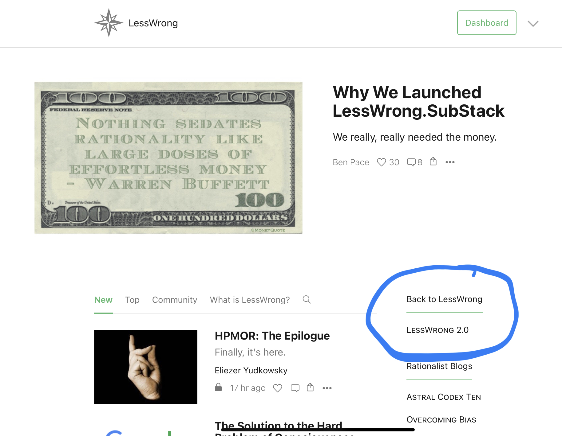 P.S. If you’d like to see the old version of LessWrong, go to the top link on the sidebar of the homepage of LessWrong.SubStack. Also all the other URLs still work. Haven’t figured out how to turn them off yet. /shrug