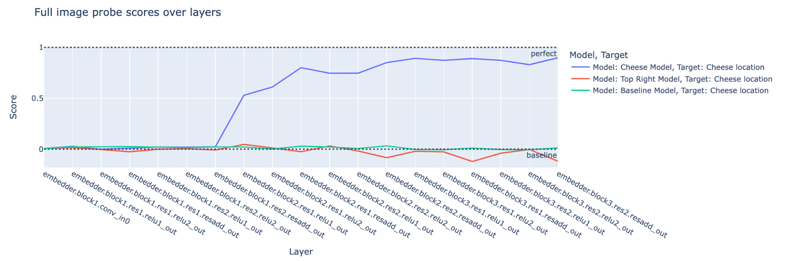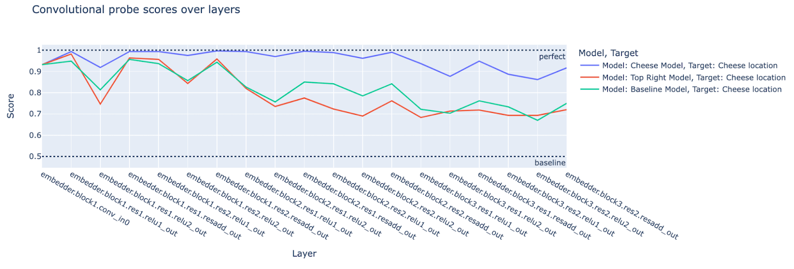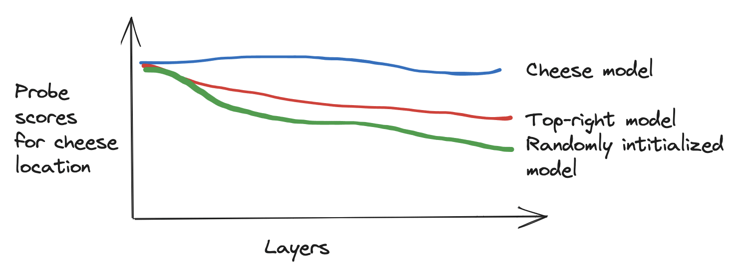 In this experiment, we take three models: the cheese model, the top-right model, and a randomly initialized/baseline model. We examine probe scores for the cheese location in each model.