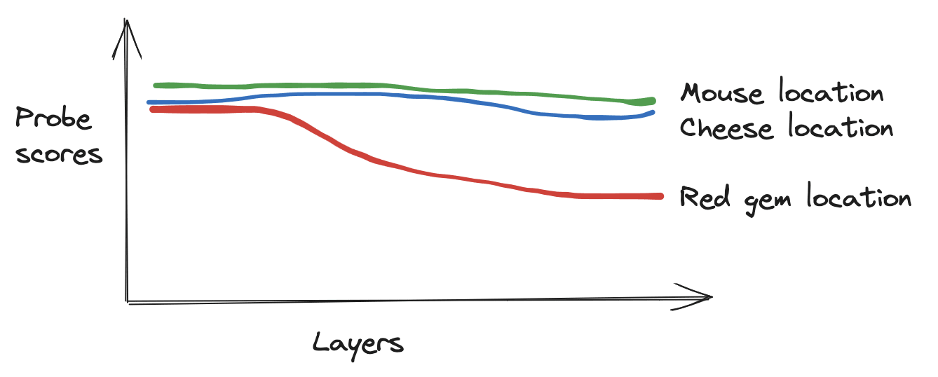 Absence of irrelevant information: We expect that probe scores for the red gem location will be relatively low compared to the cheese and mouse locations; in particular, it will be low close to the middle and end of the network, as this information is not needed to compute actions that cause the mouse to go to the cheese.