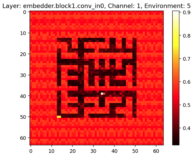 The fact that the convolutional probe scores are higher towards the beginning and middle of the network follows from the way the network architecture sequentially processes the input image; earlier layers start to extract low-level features such as (almost) paths in the maze, middle layer channels start to extract object locations such as the location of the cheese, and later layers seem to correspond to more abstract features like “go left” (see the figure below for examples of activations some channels in early and middle layers in the network. Later layer activations may be added later).