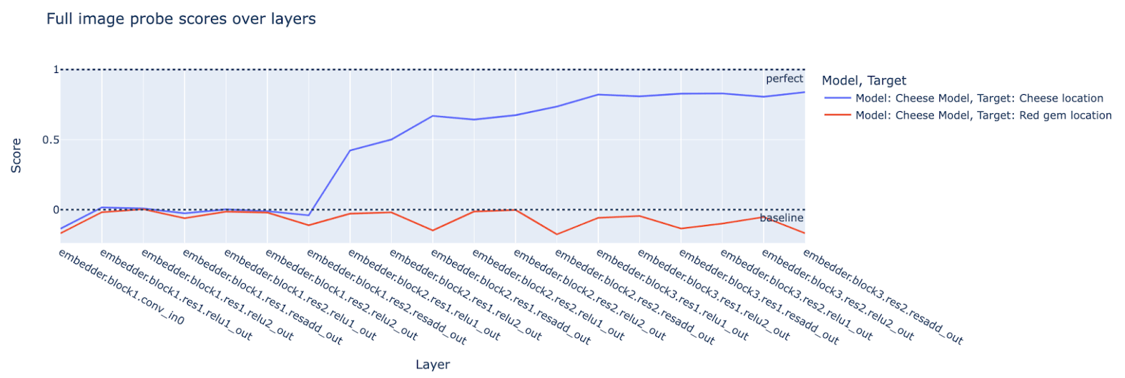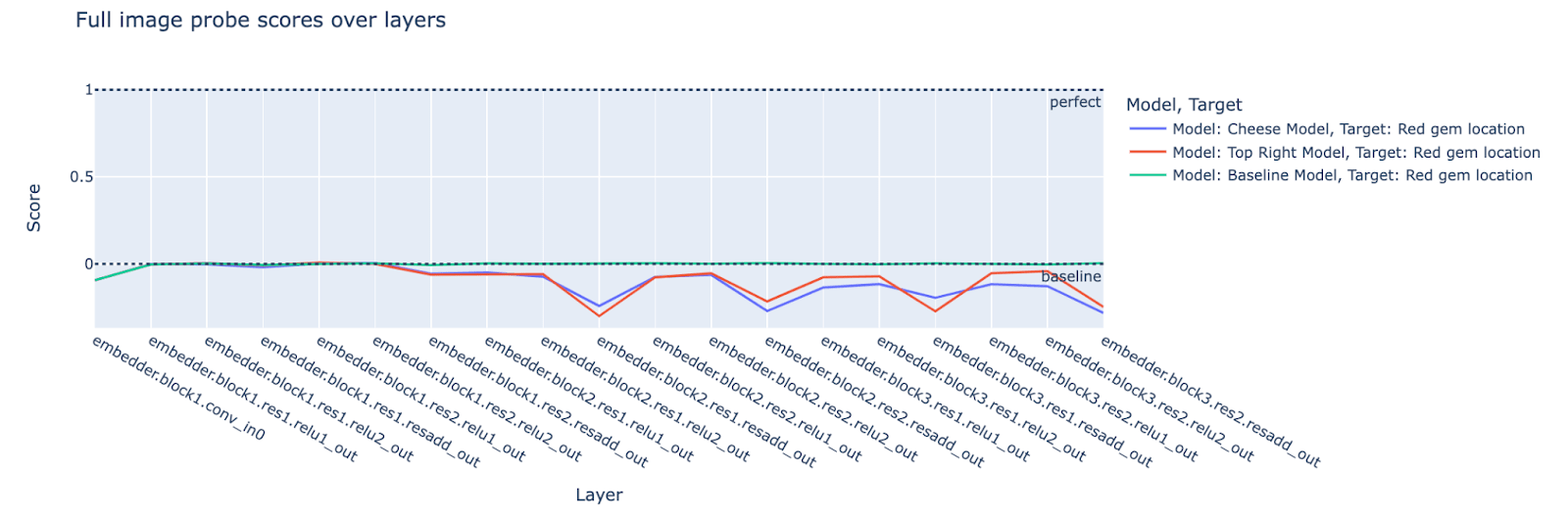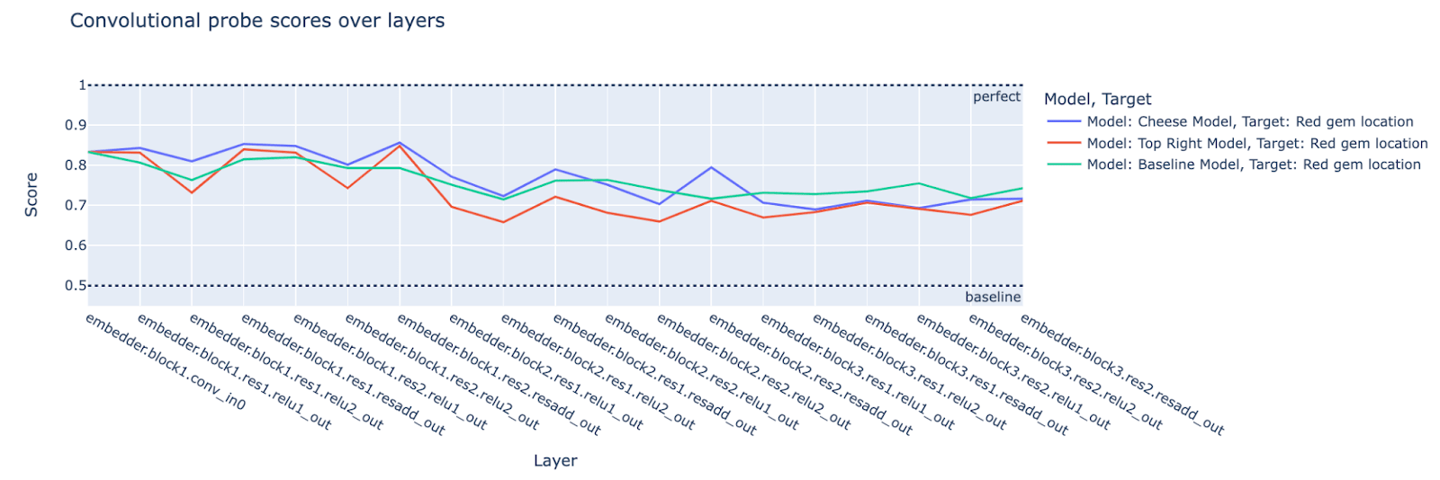 Note that the red gem location seems harder for the probes to detect than the cheese location (as seen by the convolutional probe scores for the input layer). It could be the case that the red gem information is present/being used in the later layers but just harder to detect (although note that the mouse location seems even harder to detect based on the input probe scores, yet the later layers of the model seem to be able to track the mouse location with ease). The following plots comparing the probe scores for the red gem location with the top-right and randomly initialized/baseline model suggest that the cheese model is using the red gem location information about as much as a randomly initialized model.