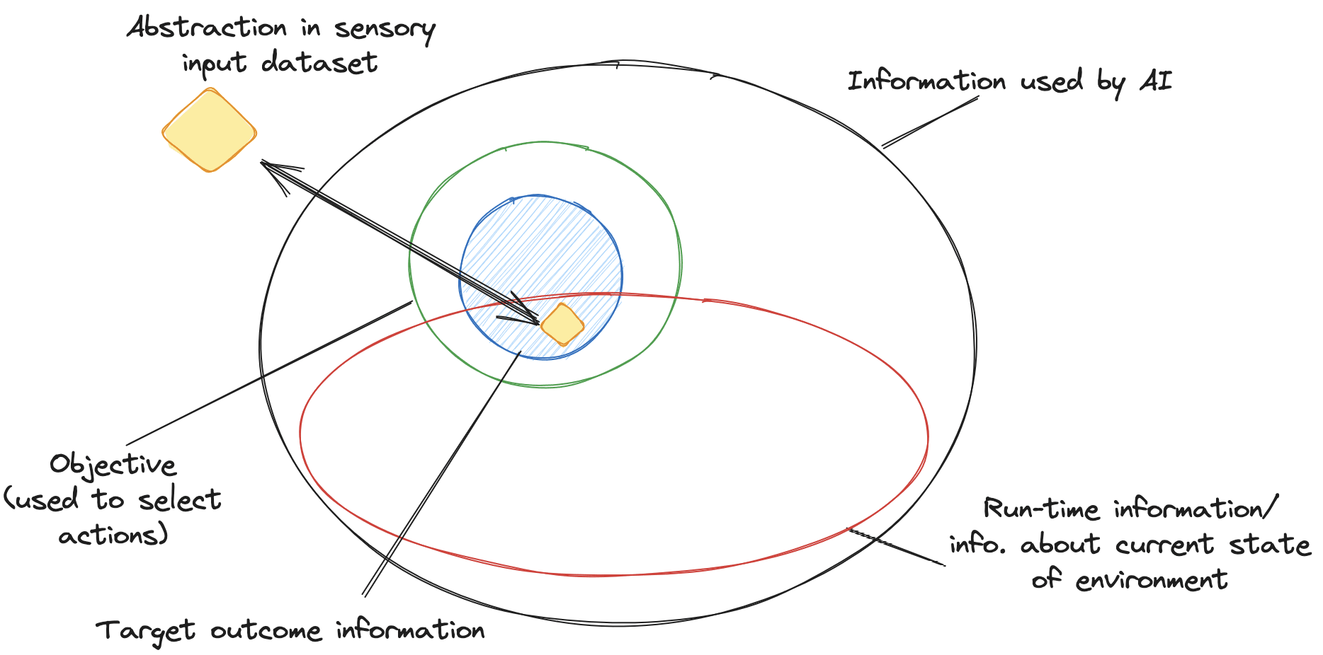 By considering runtime information in the objective and abstractions in the sensory input dataset of the agent as random variables (over the AI’s sensory input dataset), we can talk about measuring the mutual information between them.