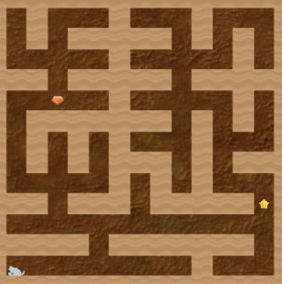 In this experiment, we take the cheese model and look at mazes that contain a randomly placed cheese and a red gem as potential target objects (mouse starts at the bottom left).