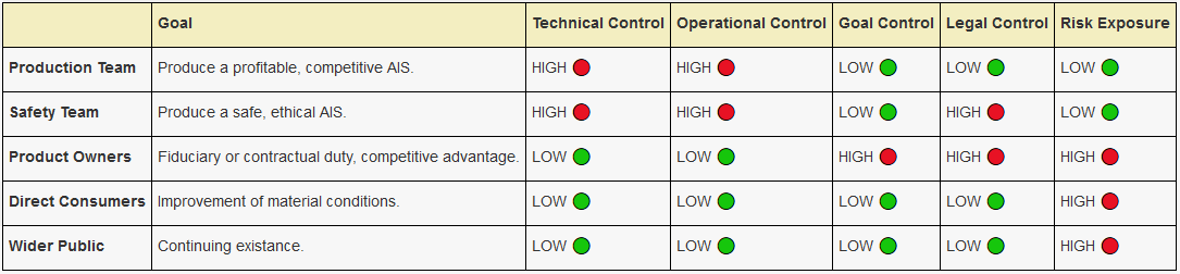 Risk Exposure: How much does each group risk by producing an unsafe AIS? For instance, a Production Team may be relatively insulated from a product they build which is deployed in some other country, while a Product Owner has some concrete ties to the real-world consequences of that product.