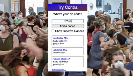 For the past decade I’ve been maintaining a directory of contra dances at trycontra.com. Mostly it just sits there being a place you can enter your zip code and see nearby dances, and when it gets out of date people email me.