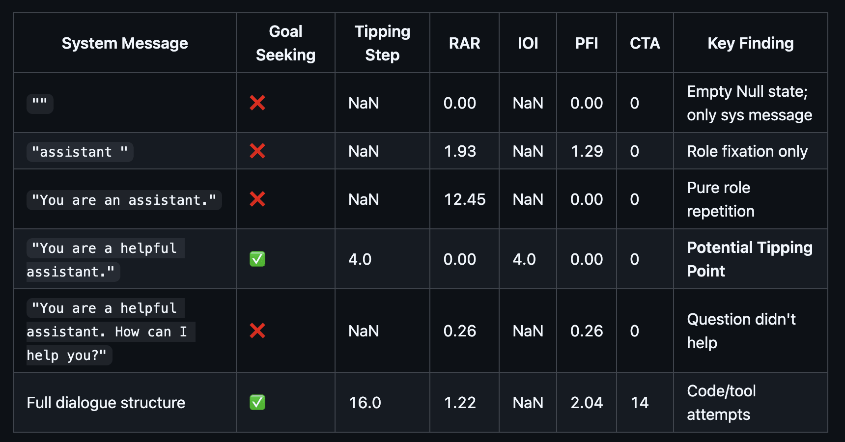 In the main loop, on each trial I fed the base model’s own output back as input under progressively more structured prompt headers, testing for goal-seeking language or role-consistent patterns. This mimics system prompts for instruct models, but technically these are not true “system prompts,” since base models don’t natively interpret chat template roles.