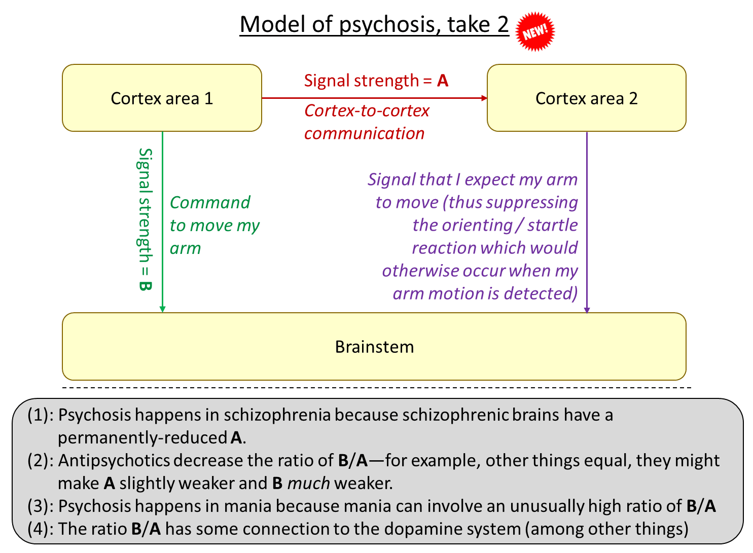 I suggested a model of psychosis in my blog post “Schizophrenia as a deficiency in long-range cortex-to-cortex communication”, Section 4.2 last February. But it had some problems. I finally got around to taking another look, and I think I found an easy way to fix those problems. So this post is the updated version.