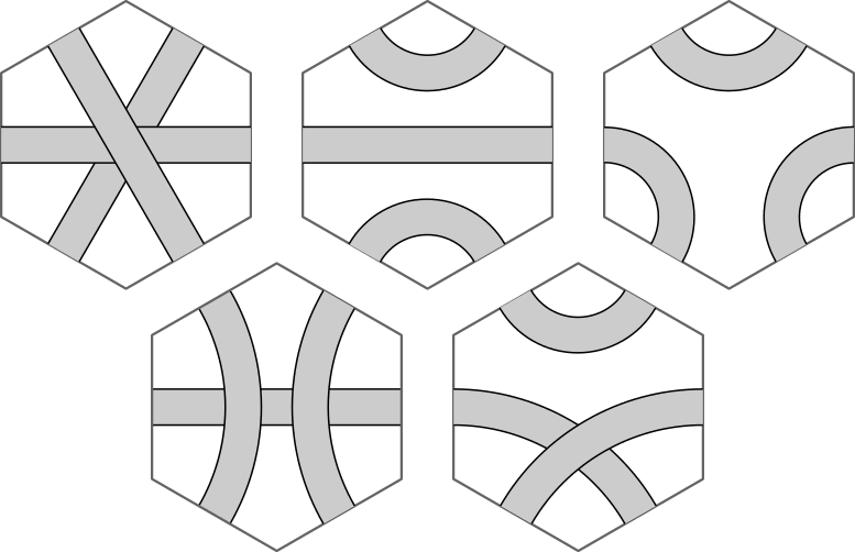 A thicker path usually looks a bit better (this seems to also apply for normal Celtic knots). Each hex tile has some combination of straights (connecting opposite sides of the hex), corners (connecting adjacent sides) and arcs (connecting sides neither opposite nor adjacent). I think patterns making heavy use of arcs look best.