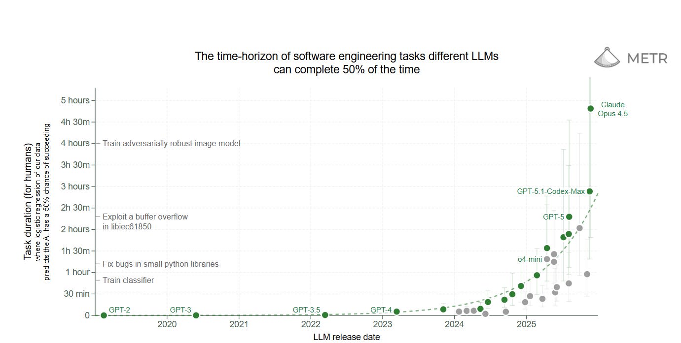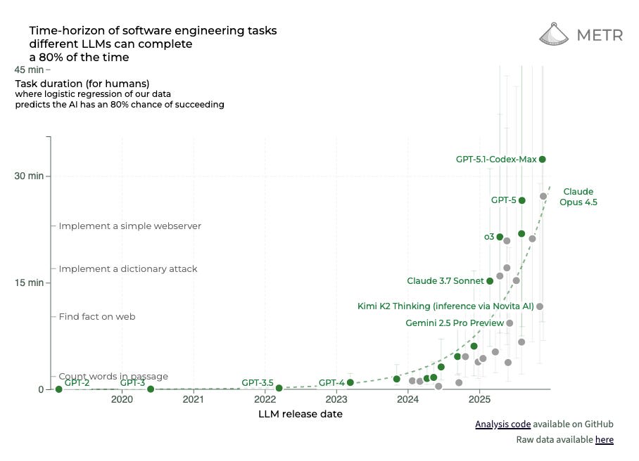 Nathan Witkin has an essay criticizing using METR as evidence called “Against the ‘METR Graph.’” The METR graph, remember, is the one that found that AI can perform software tasks with 50% accuracy that take humans several hours, and this is doubling every seven months. Nathan provides a number of criticisms. First, he notes that those citing the METR graph consistently rely on the graph showing the length of tasks AI can complete with 50% accuracy. The 80% accuracy graph is a lot more modest.
