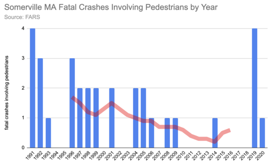 (I’m being lazy here and charting “traffic accidents with a fatality and involving at least one pedestrian”. The FARS data does make it possible to see whether it was a pedestrian that died, but this requires joining CSVs in a way that’s a bit awkward. In the ones I’ve spot checked the fatality was a pedestrian, which is what you’d expect.)