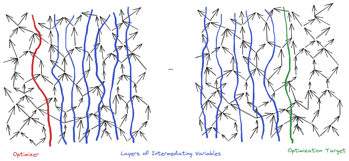 Once we have two distributions over the optimizer’s direct outputs, they induce two distributions over each subsequent layer of intermediating variables, simply by propagating through each layer: