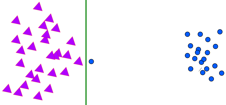 You get the idea. The difference between Hard and Soft Support Vector Machines is somewhat analogous between the difference between committing to a hypothesis class ahead of time, and utilizing Structural Risk Minimization which has a weighting function over different hypothesis classes. In the above example, a Soft Support Vector Machine would probably bite the bullet and classify the one blue point incorrectly, in exchange for a much larger margin to the nearest correctly classified points.