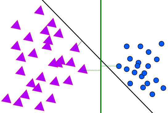 both the black and the green hyperplanes classify all instances correctly, but only the green one is (approximately) a Hard Support Vector Machine, because the distance to the nearest points (dotted lines) is maximized. Note that for a true Hard Support Vector Machine, generally there will be a bunch of nearest points with identical distance (because if there was just one, then the hyperplane could very likely be moved in such a way that distance to that point increases while distance to other points might decrease, leading to a higher minimal distance). In two-dimensional space, there will likely be two such points. On the other hand, the black hyperplane is not a Hard Support Vector Machine, and indeed the minimal margin could be slightly improved by moving it to the bottom left, such that the margin to the nearest triangle decreases but that to the nearest circle increases.