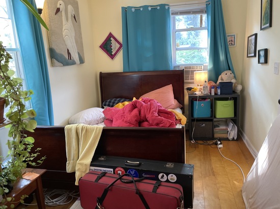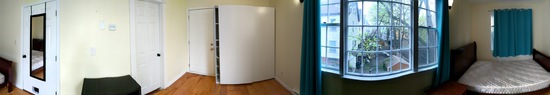 The near bedroom could also be rented out. It has one window, and it tends to be noisier because it’s near the main living space. In winter this room is warmer. This room is available now.
