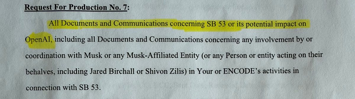 You might recall a story in the SF Standard that talked about OpenAI retaliating against critics. Among other things, OpenAI asked for all my private communications on SB 53 – a bill that creates new transparency rules and whistleblower protections at large AI companies.