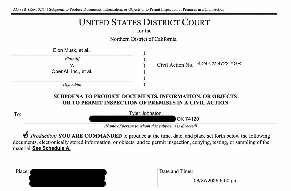In return, got a knock at my door in Oklahoma with a demand for every text/email/document that, in the “broadest sense permitted,” relates to OpenAI’s governance and investors.