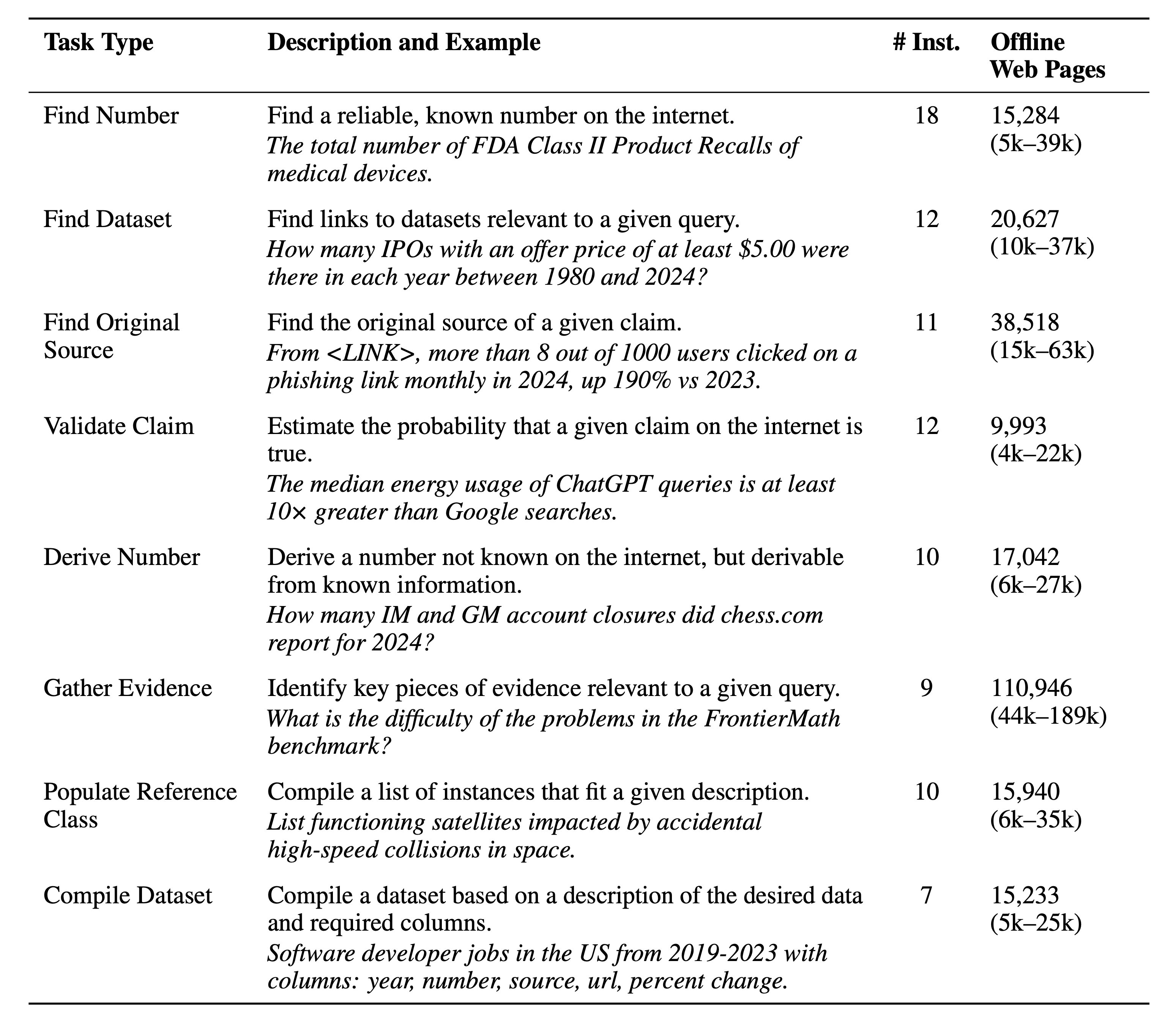 Full methods in the paper. In brief, we created web research tasks, carefully worked out the correct answers, and scraped and stored a large chunk of webpages offline for the agents to search, read, and reason about to succeed in the task.