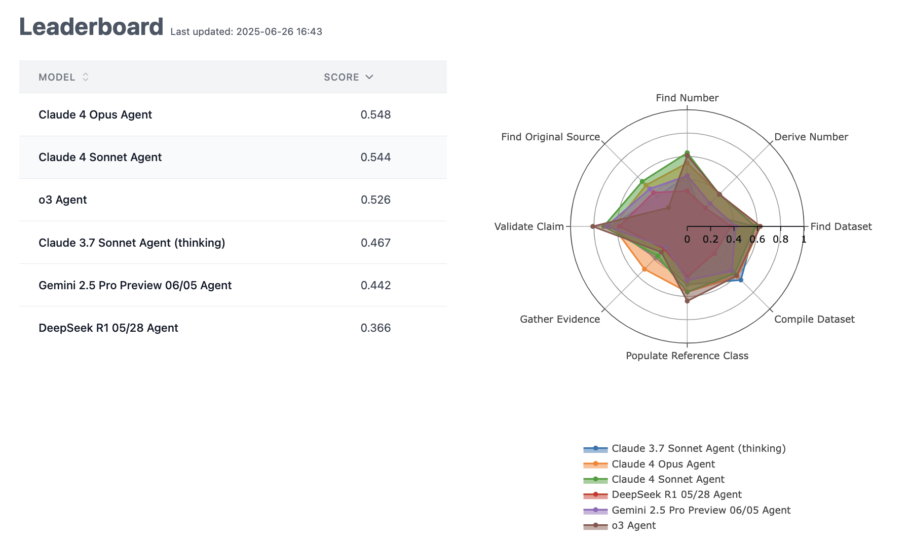 We have a continuously updated benchmark available at evals.futuresearch.ai that includes newer models such as Claude 4 (but no commercial web research tools) and is run on a frozen snapshot of the internet.[2] We’ll refer to the continuously updated benchmark as DRB, and the paper version as DRB-250506. Results between the two cannot be compared directly: since the publication of the paper, we have updated both a few of our tasks as well as the agent architecture powering the LLMs.
