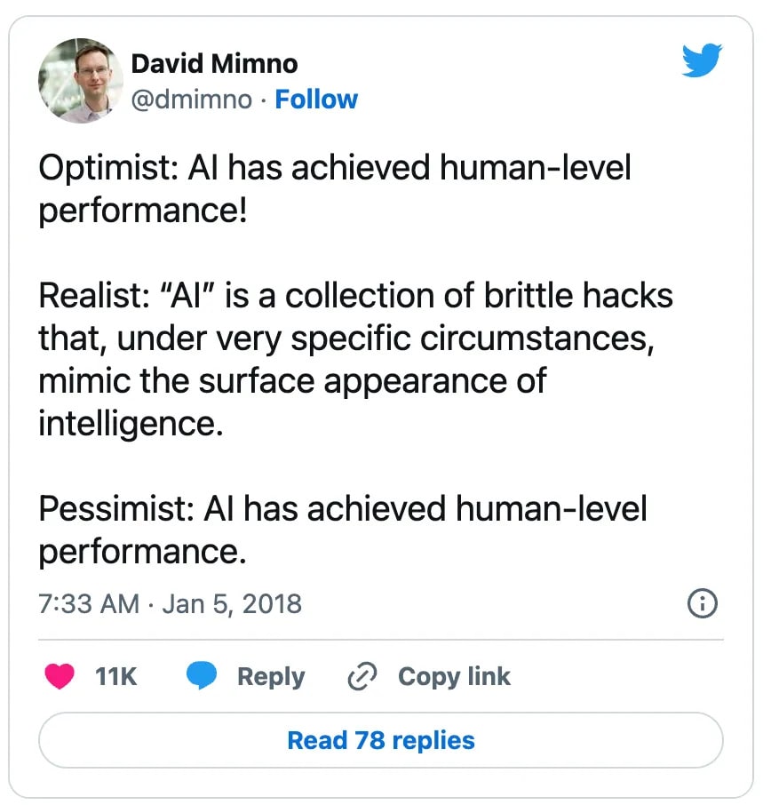 Does this matter? I mean, if you get the answer, then you get the answer. But in mathematics, much of the value in finding a proof is the insights you acquired along the way. If AIs begin knocking off unsolved problems in mathematics, but in ways that don’t provide insight, perhaps we’ll still need mathematicians to do the real work of advancing the overall field. Or maybe, once AIs can solve these problems at all, it’ll be a short step to solving them with insight? My instinct is that it’s not a short step, but that could be cope. In any case, the big question is what this tells us about AI’s potential in applications other than mathematics. What portion of human activity requires real insight?Source: https://x.com/dmimno/status/949302857651671040 To put it another way: compared to people, large language models seem to be superhuman in crystallized knowledge, which seems to be masking shortcomings in fluid intelligence. Is that a dead end, great for benchmarks but bad for a lot of work in the real world? Or is it a feasible path to human-level performance?