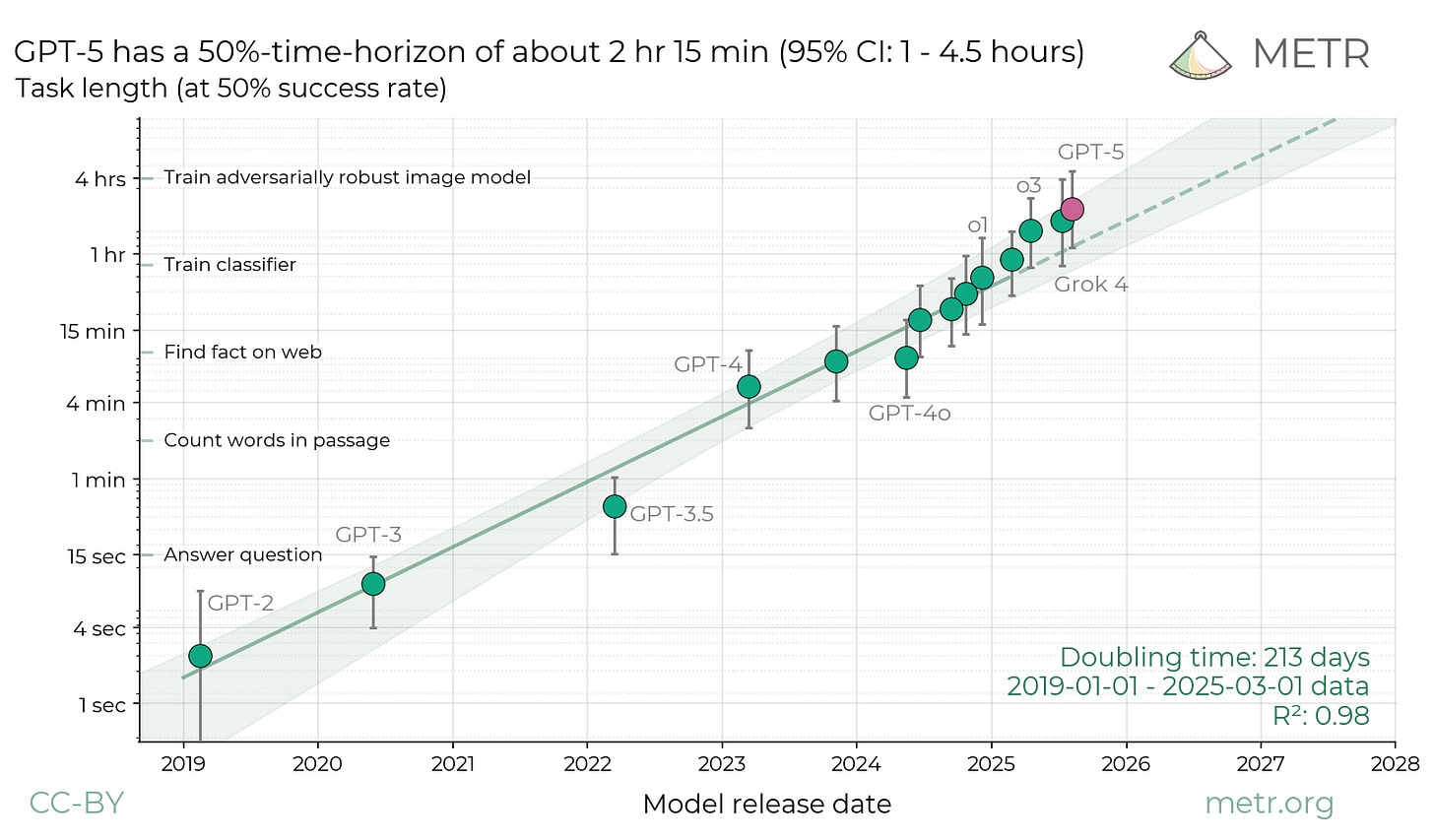 This is the latest version, updated to include GPT-5 (source) It shows that the size of software engineering tasks an AI can complete has been roughly doubling every 7 months. This trend has held for over 5 years (arguably[5]), during which the achievable task size increased from around 3 seconds to around 2 hours. Why should the trend be so steady?