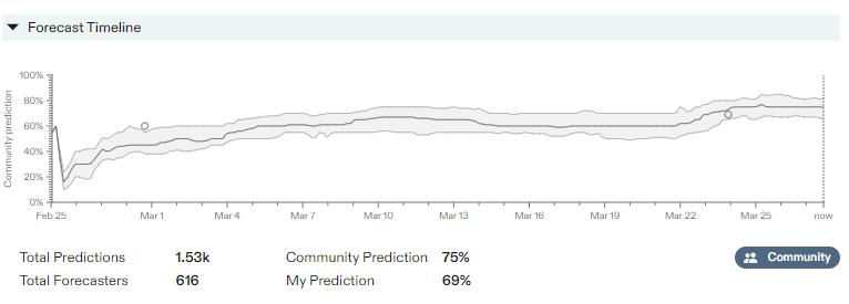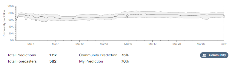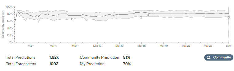 After I wrote this, I checked Polymarket, and real money talks at least a bit, this is currently at 73% and ends a month earlier.