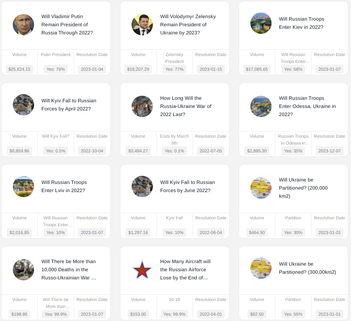 It has been about two weeks since I last looked at the prediction markets for the invasion of Ukraine. Since then, prices on many markets have shifted quite a lot, so it is once again time to examine what the markets seem to be telling us.
