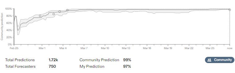 Even more than before, the overall market on the six cities is now mostly a market on Kharkiv. Kyiv, Lviv and Odesa are highly unlikely to fall without a general collapse. Kherson and Mariupol will count as having fallen, or if they don’t then Kharkiv was in almost no danger. So these are now the same. It is a good sign that Metaculus users collectively reached the same conclusion.