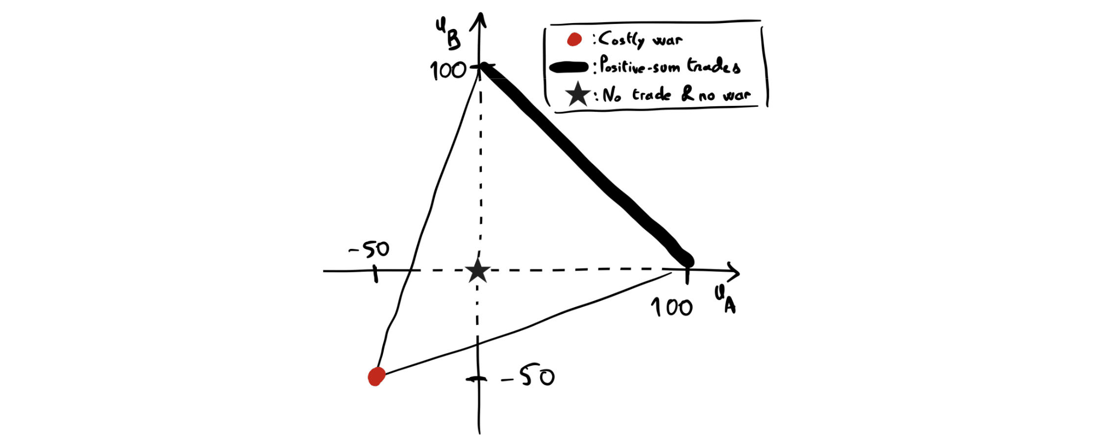 Why do the players not just avoid conflict entirely and go to the Pareto frontier? Let’s construct plausible beliefs under which Aliceland is not incentivized to propose a point strictly better than the PMM for Bobbesia:
