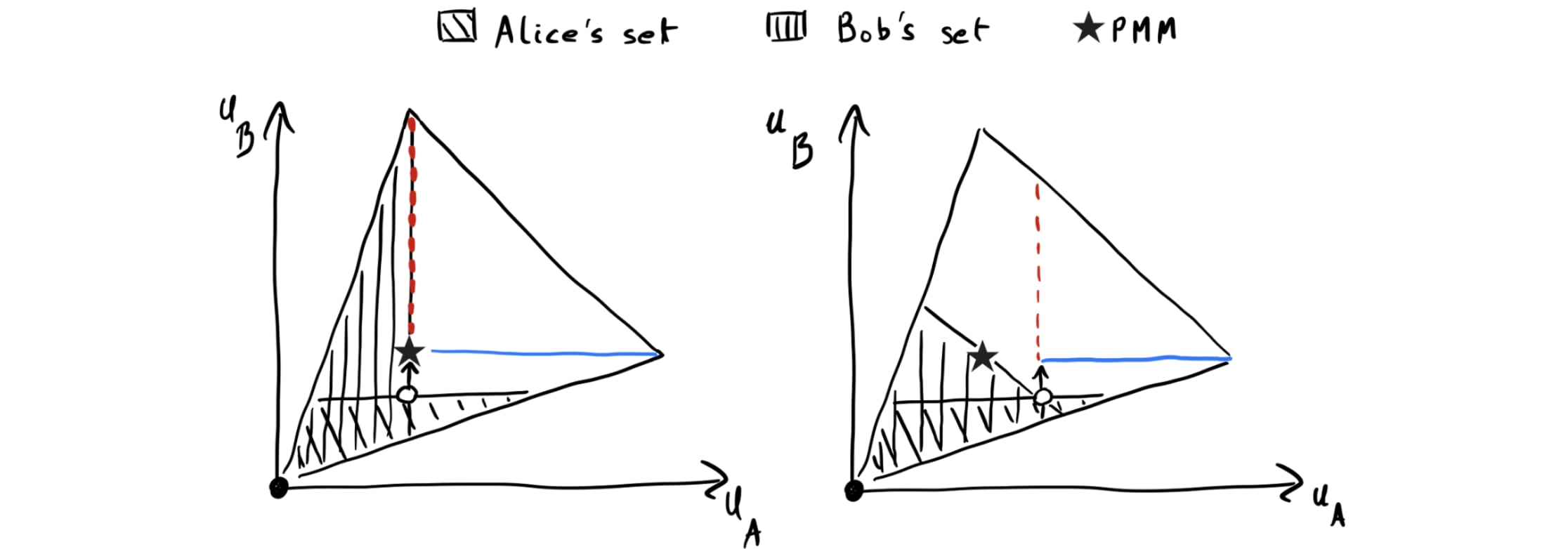 You might see where this is going: By a symmetric argument, Bob is never worse off PMP-extending his renegotiation set (adding the red dotted line in Fig. 6), assuming Alice doesn’t punish him for doing so. And if both Bob and Alice add their PMP, they are guaranteed the PMM (left plot of Fig. 6) or Pareto-better (second plot of Fig. 6).