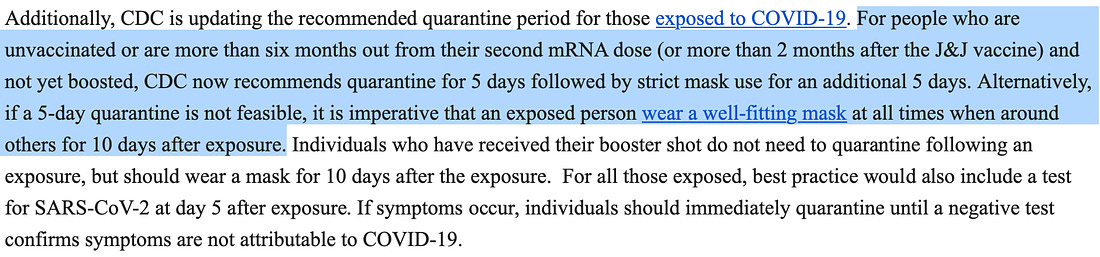 Additionally, CDC is updating the recommended quarantine period for those exposed to COVID-19. For people who are unvaccinated or are more than six months out from their second mRNA dose (or more than 2 months after the J&J vaccine) and not yet boosted, CDC now recommends quarantine for 5 days followed by strict mask use for an additional 5 days. Alternatively, if a 5-day quarantine is not feasible, it is imperative that an exposed person wear a well-fitting mask at all times when around others for 10 days after exposure. Individuals who have received their booster shot do not need to quarantine following an exposure, but should wear a mask for 10 days after the exposure. For all those exposed, best practice would also include a test for SARS-CoV-2 at day 5 after exposure. If symptoms occur, individuals should immediately quarantine until a negative test confirms symptoms are not attributable to COVID-19.