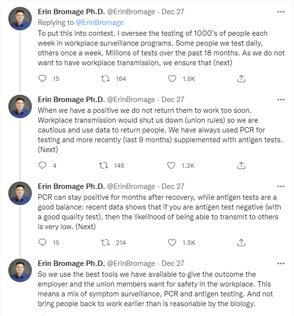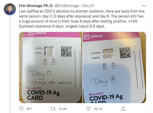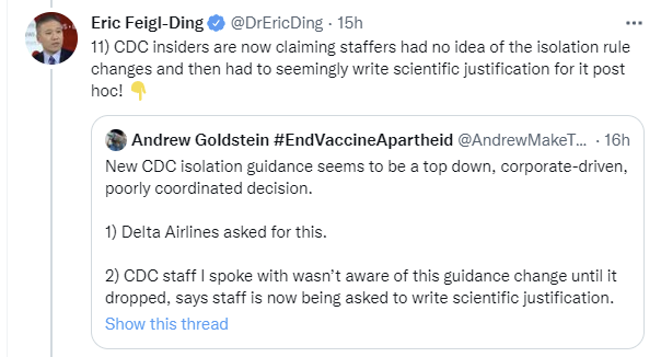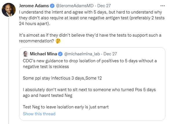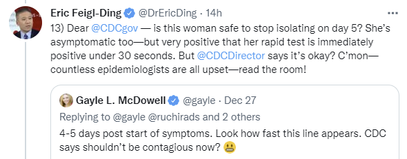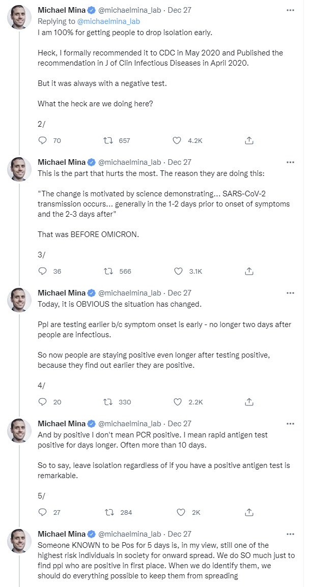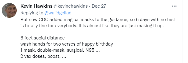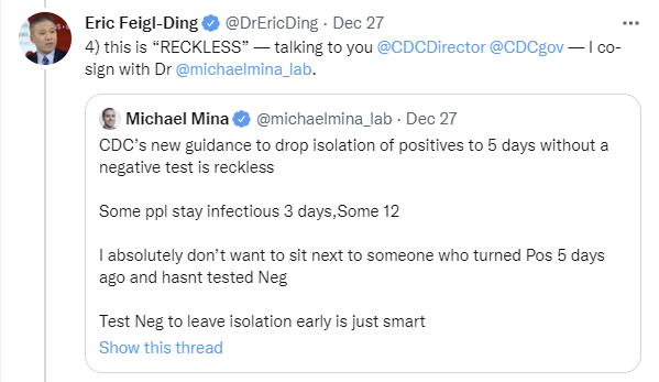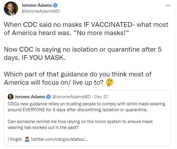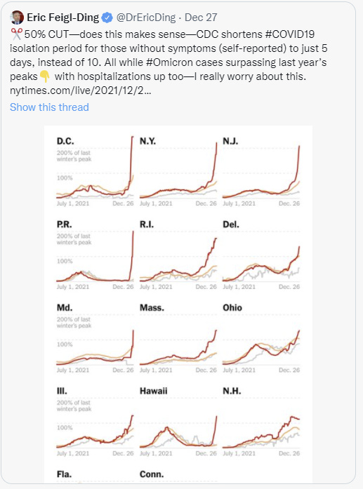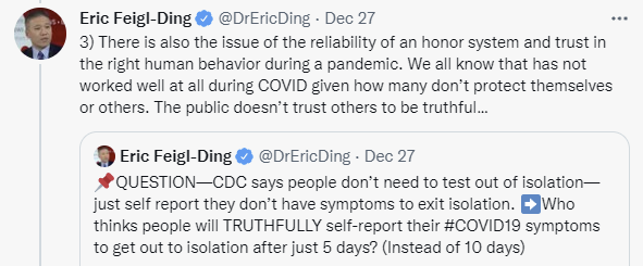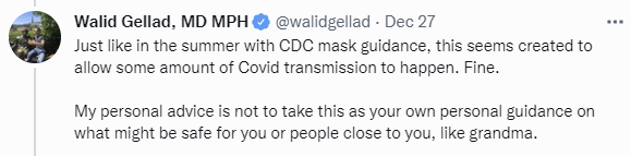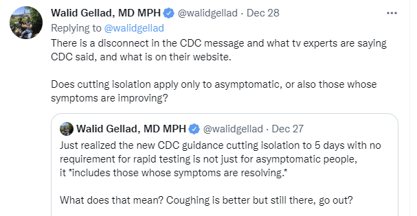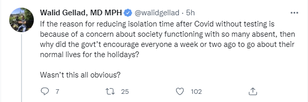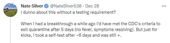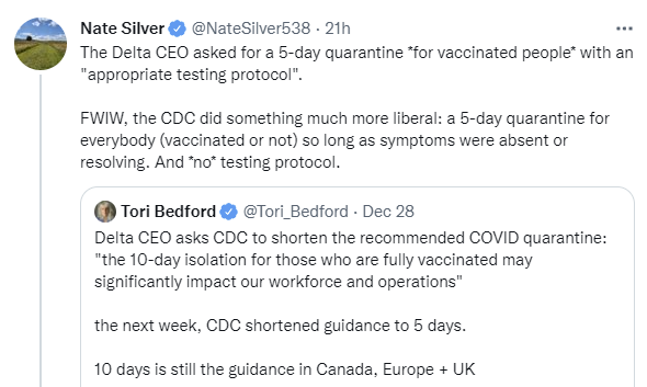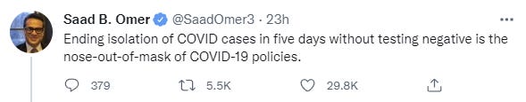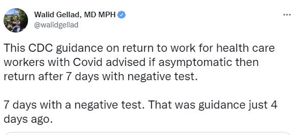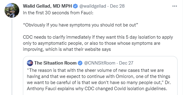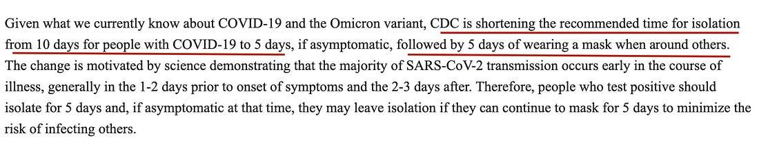 So in the interest of making sure people could do those things, we’re shortening the period to five days. Understandable? Definitely. I can’t argue with it. I’m all for ‘following the economics.’ The isolation guidelines didn’t match the reality on the ground. They had to change to match reality.