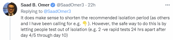 Note the lack of a requirement of a negative test of any kind. A PCR test isn’t an option because such tests stay positive for longer than five days, but a rapid test is for exactly this situation. It measures whether you’re infectious or not.