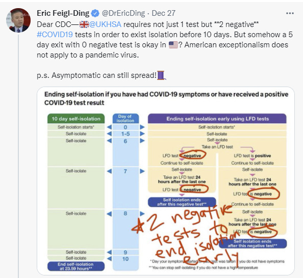 This is technically true, but clearly intended to mislead, by giving impression UK is 10 days plus test versus US being 5 days but no test. That’s not the case. The UK here is saying two negative tests lets you leave early. The CDC isn’t giving people that option, but should give people that option. So this is 5 days versus 7-10 days, depending on how the tests go.