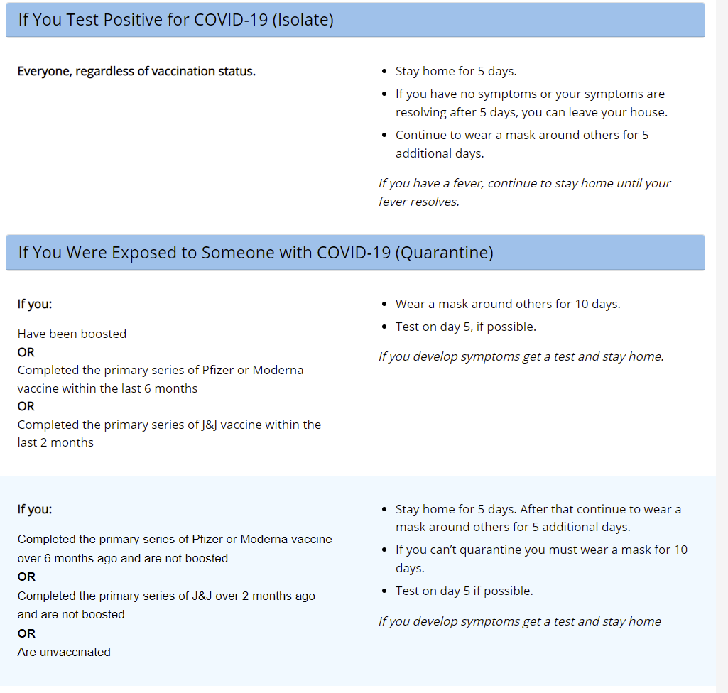 Isolation relates to behavior after a confirmed infection. Isolation for 5 days followed by wearing a well-fitting mask will minimize the risk of spreading the virus to others. Quarantine refers to the time following exposure to the virus or close contact with someone known to have COVID-19. Both updates come as the Omicron variant continues to spread throughout the U.S. and reflects the current science on when and for how long a person is maximally infectious.