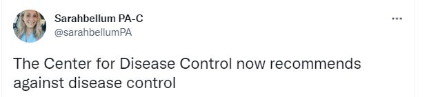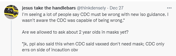 The fundamental problem continues to be the mindset that the CDC is supposed to take a stupid unbalanced position in favor of absurd Sacrifices to the Gods, and then we’re supposed to say ‘that’s nice, dear’ and compromise between that and other considerations, rather than the CDC doing something reasonable. Which results in statements like this resonating with people.