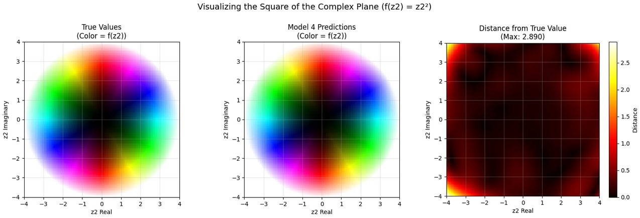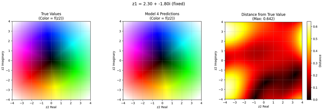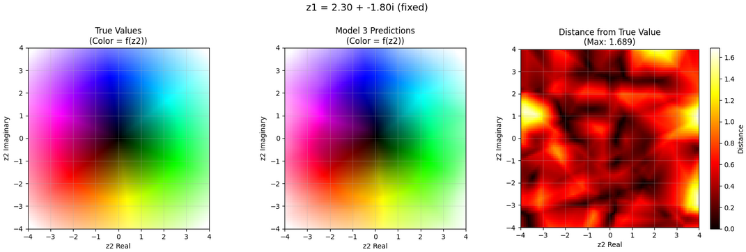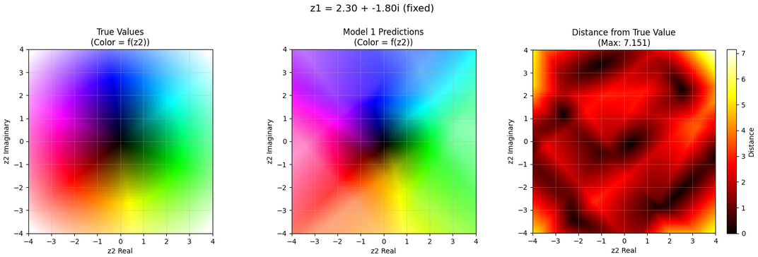 After experimenting with some ways to visualize what these functions learned, I ended up doing the following: I created an interactive widget where you can set re + im part of one of the input numbers. It would then render a 2D function, mapping re + im parts of the second input number to a color that represents the output number (using angle + distance for colorization). While this is a bit hard to interpret concretely, it does allow for quick visual comparison of the real function vs what the networks learned. I then also rendered a heatmap to show the diff between the learned and real function.