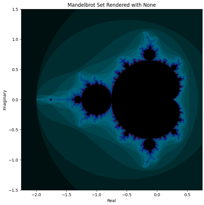For reference, here’s the actual Mandelbrot, when rendered correctly (with some arbitrary color gradient based on iterations it took to detect divergence):