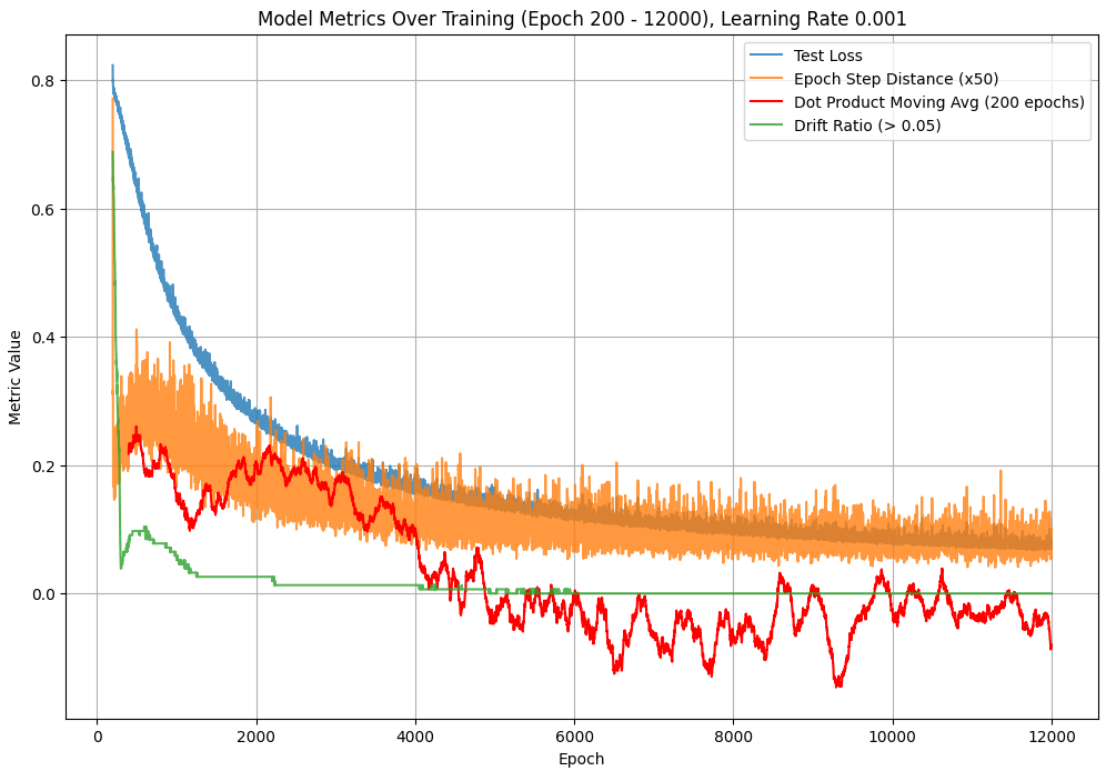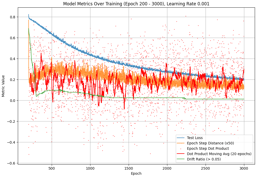 Indeed, the test loss is much less volatile here—and even reaches a lower loss than before (~0.2 after 3000 epochs, compared to ~0.23 with the previous higher learning rate). Additionally it appears that the dot product is now (for the observed 3000 epochs) consistently positive, suggesting that parameters are moving much more regularly/predictably in slowly-changing directions rather than back-and-forth. I would suppose that the dot product eventually drops below 0 here as well. Alright, let’s test that as well, and then we call it a day.