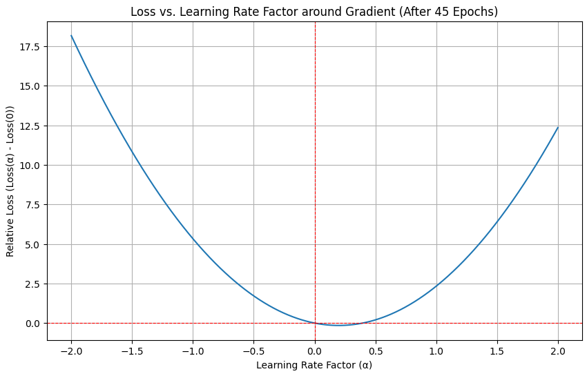 So, again, what do we see here? The x axis shows different scaling factors for the gradient of the model at that point in time. The y axis then shows the relative loss of the network, when the current gradient times the learning rate times the given factor is applied to the model weights (relative to the loss of the model without a change). So, 3 things should be pretty certain and are indeed the case here: