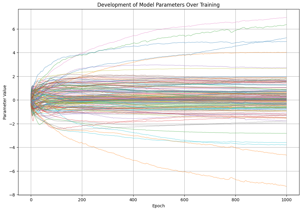 So, does this look more like option 1 or option 2? Well, hard to say, but perhaps a bit closer to option 1. While most parameters have “settled down” after the first few hundred epochs, clearly some of them are still on a mission, though. I was also a bit surprised how smoothly many of them are moving. The above was with a learning rate of 0.01. Increasing it to 0.03, I got the following: