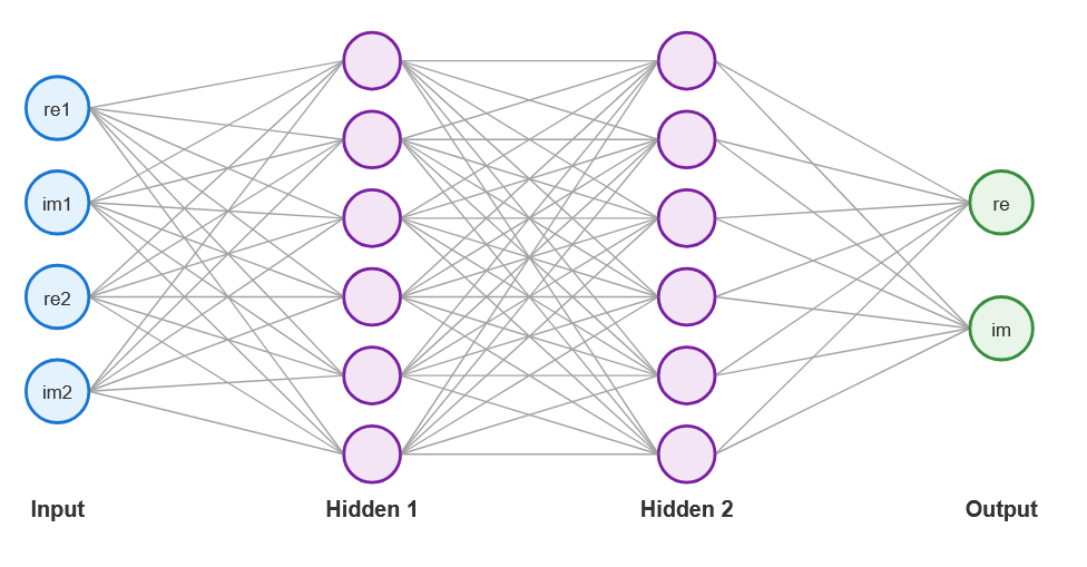 As I wanted to train a network on complex number multiplication, I needed 4 inputs (real and imaginary part of two complex numbers) and 2 outputs (real and imaginary part of the result). I varied the number and width of hidden layers throughout my experiments.